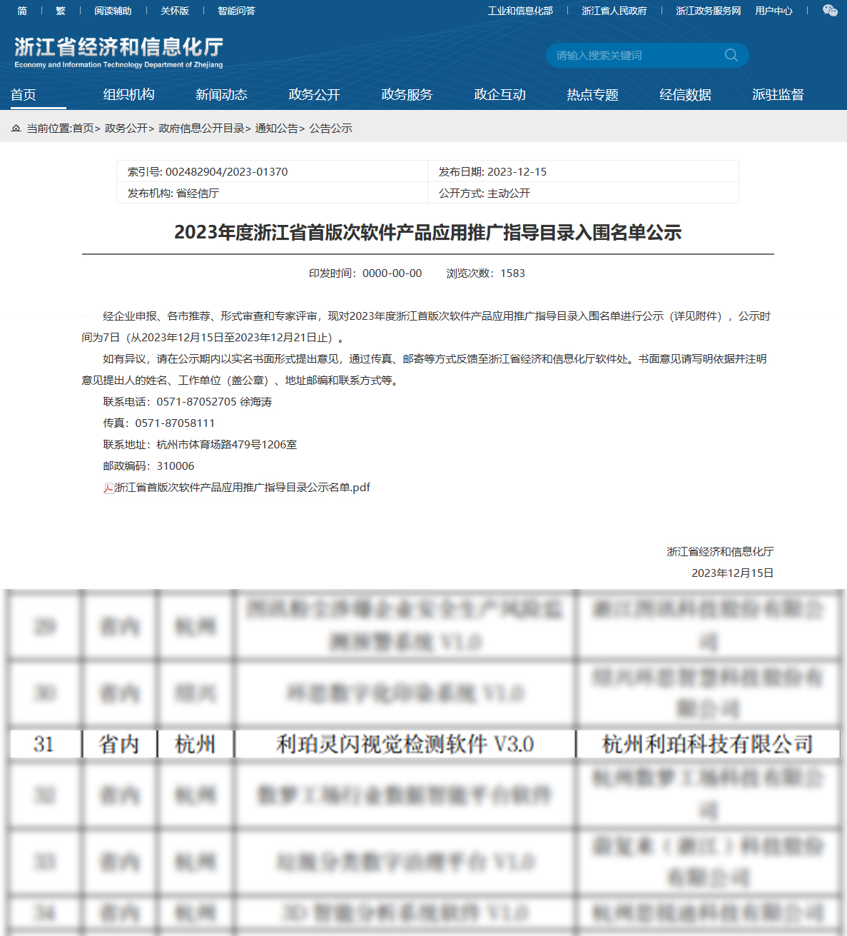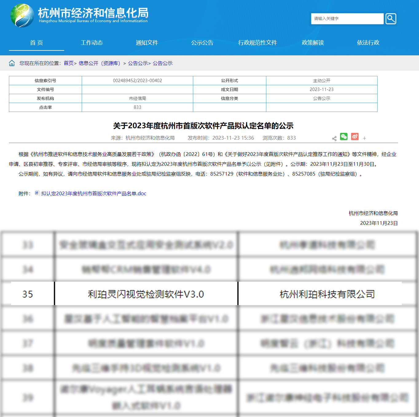 “利珀靈閃視覺(jué)檢測(cè)軟件V3.0”成功入選2023年度浙江省和杭州市次軟件產(chǎn)品認(rèn)定名單
