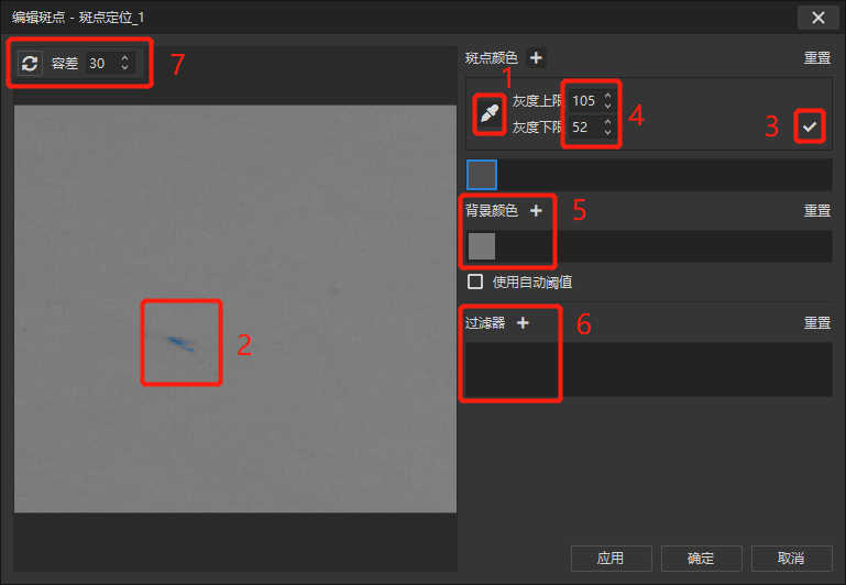 然后在參數(shù)欄打開斑點(diǎn)配置界面,用戶可以按照以下步驟完成斑點(diǎn)提取,順序與圖中的序號一一對應(yīng):