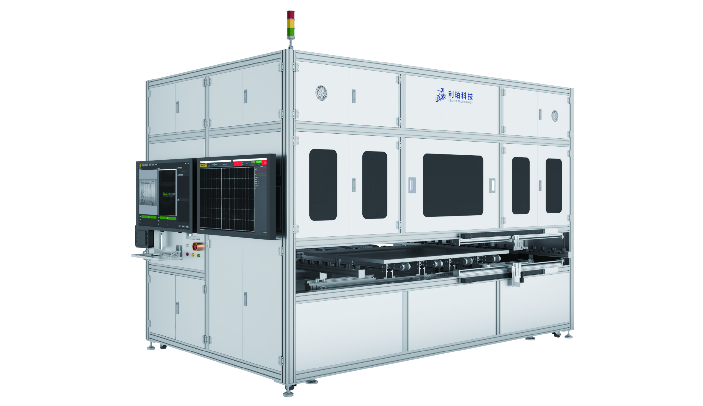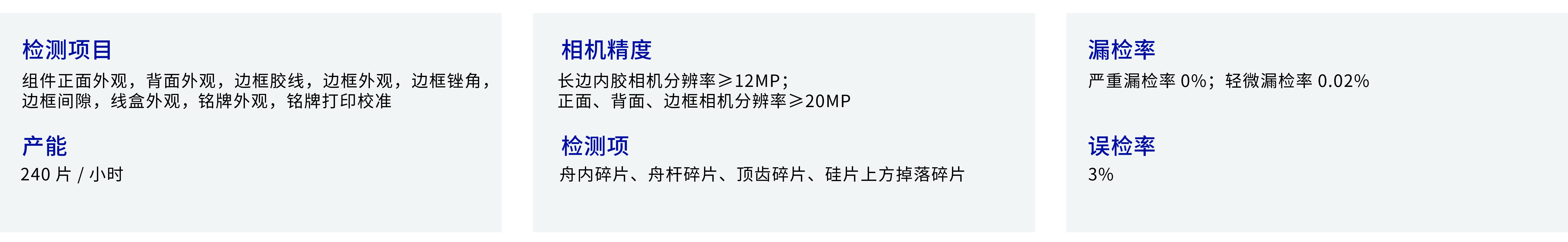 終檢外觀一體機檢測設備,用于在最終檢驗階段對組件正背面外觀、邊框、接線盒及銘牌的缺陷檢測做在線全檢,并根據(jù)自動檢測結果實時標注在人機交互界面上,同時綁定 id 將對應信息上傳 MES,搭配定制復判系統(tǒng)提高識別準確性及可靠性。