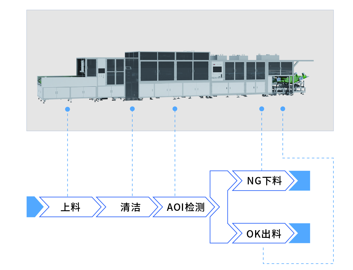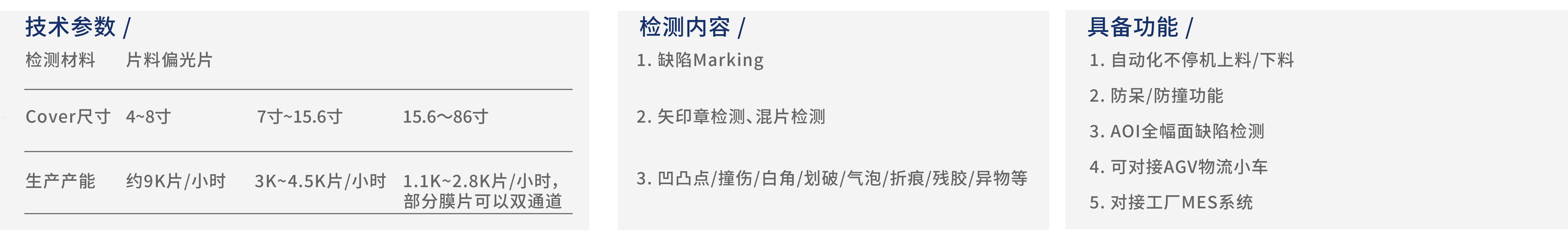 設備用于偏光片的檢測,采用自動上下料以及特制輸送結(jié)構,搭配自研AOI檢測軟件,對矢印章、缺陷打標Mark、異物、氣泡、劃傷、凹凸點、折痕、撞傷、殘膠、臟污等缺陷進行精準檢測以及OK/NG分流,把控出貨產(chǎn)品質(zhì)量。
